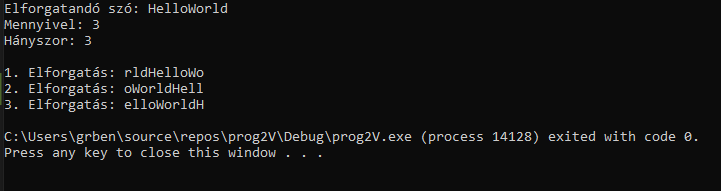 Az alábbi képen a program kimenete látható. A HelloWorld szót forgattuk el, három karakterrel és három alkalommal. Az első elforgatásnál látható, hogy a szó utolsó három karaktere “rld” a szó elejére kerül, megalkotva az “rldHelloWo” szót. Mivel az elforgatás összesen háromszor történik meg, ezért az eredetileg megadott szóból végül “elloWorldH” lesz.